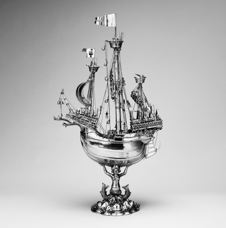 Das Schiff symbolisierte um 1500 ganz im Sinne der mittelalterlichen Vorstellung noch immer die transzendente Pilgerreise des Christen auf Erden. Zugleich stand es auch für das Verkehrs- und Transportmittel, durch das die Umsegelung der Welt und transkontinentale Wanderungen erst möglich wurden. Es versinnbildlichte die tatsächliche Aneignung der Welt und somit die mentale Überschreitung der Grenzen, wie sie noch für das Mittelalter konstitutiv gewesen waren. Der aus vergoldetem Silber angefertigte Tafelaufsatz aus Nürnberg, das eine zeittypische Karacke mit insgesamt 74 Figuren als Besatzung und Passagiere darstellt, ist ein repräsentatives Trinkgerät. Es wurde zur Zierde einer festlichen Tafel bestimmt und demonstrierte Status und Reichtum seines Eigentümers.