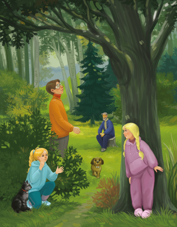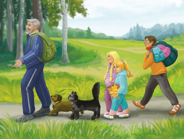 В выходной не надо в школу,Отправляемся в поход:Я, сестрёнка и Никола,Шарик, дедушка и кот.В экспедицию уходим,Изучать осенний лес.Дед наш – главный, и он, вроде,Знает все места окрест.Но лишь только мы шагнули,Старость деда подвела.Произнёс:– Идите сами.Память судорога свела!Поучитесь в лесной школе(Гладит шёрстку у кота).Вы теперь свободны, что ли,Как лесная детвора.И присел дед на пенёк,Рядом Шарик сел и кот.И втроём заулыбалисьИ лесной мечте отдались.Огорчились мы немножко,Но пошли своей дорожкой,Завернули на полянкуИ устроили стоянку.Только в прятки заиграли —К нам примчались кот и Шарик.Вместе лес мы изучали,Веселились и кричали…А про деда не забыли —Всю дорогу с ним шутили,Когда вели его домойВ день осенний выходной.