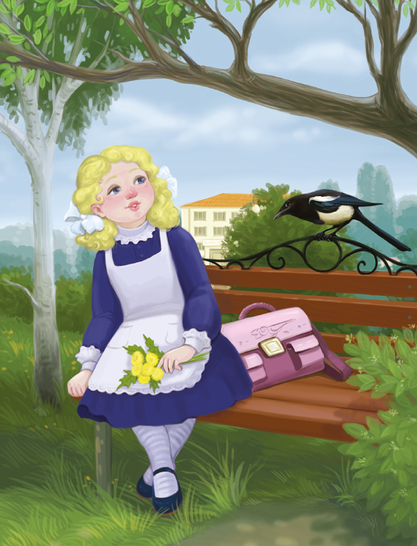 Подружилась я с сорокой —Бочок её белый.И кормлю своей заботой,Чтоб не улетела.Большой хвост – длиннее тела,С грудкой посинелой,На портфель ко мне присела,Стала очень смелой…Она клюнула замочек,Он сверкнул под солнцем.И без всяких заморочекПросится в питомцы.Первоклашкам снисхождение —Малые детишки,И из птичек окружениеНам совсем не лишнее.Мама с папой согласились —Дружбу одобряют.И теперь меня подружкаС уроков встречает.