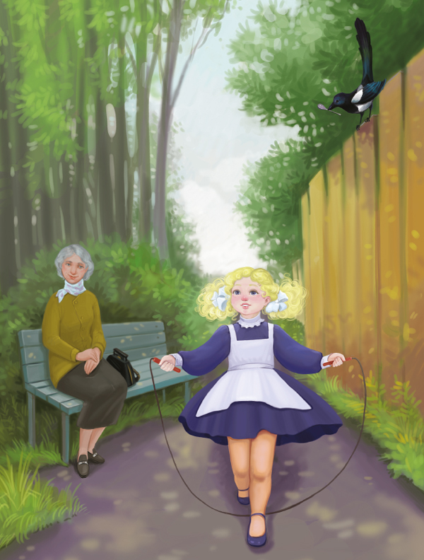 Подарила бабушкаДетскую скакалку.И учусь я прыгатьПод новую считалку.Скакать-прыгать я люблю:Ведь дружу с сорокой!И считать тоже могу,Только без подскока.Как подпрыгну – слово вспомню,Приземлюсь – забуду.И лишь бабушка напомнит,Как зовётся блюдо.Я считаю: раз да два,Щи люблю да кашу.Три, четыре – чай налила…Но где ложка наша?Загалдела вдруг воровка,Как подскочит в небо!На глазах и очень ловкоС блестяшкой улетела!Но мы с бабой не жалеем —У нас ложек много!А с сорокой веселее,Дружим с ней особо…