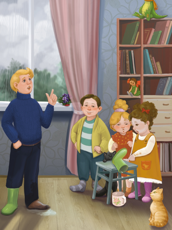 В день осенний и дождливыйСтало как-то всем тоскливо:В окна капельки стучат,Кошки в доме не шалят.Посмотрели из окошкаИ увидели Антошку:В руке зонт, забыв про страх,Лужи мерит в сапогах.Но внезапно он споткнулсяИ в водичку окунулся.– Ах! – вскричали дружно мы. —Из лужи он набрал воды!Застучали по окошку,Пригласили в дом Антошку,Из сапог воду сливать,Кружкой воду замерять.Но собрали капли три,Остальные не нашли…Брат картинно в позу встал,Улыбнулся и сказал:– Физику учите, дети,Чтоб узнать секреты эти!