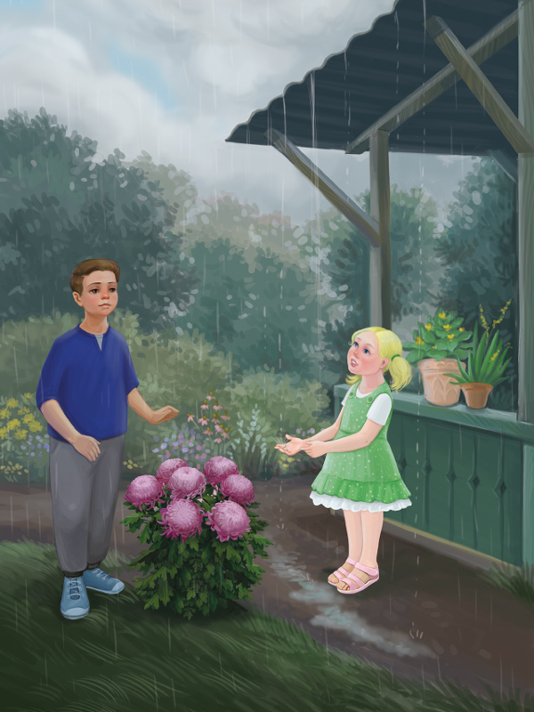 Дождь полил цветочек мой,Удивил он красотой!Брат взглянул и предсказал:– Ах! В саду будет скандал!Как прекрасно он цветётИ бутоном стебель гнёт!Радугой своих цветовВсех друзей собрать готов!Но цветы решили сами,Как им жить под небесами:Объявление издалиОб осеннем карнавале.Жаль, мне промокать нельзя…Только капельку дождяЯ ловлю в ладонь свою,А цветочку говорю:– Ты цвети! Я в первый разСобираюсь в первый класс.Я тебя в букет возьмуИ к груди своей прижму…Я с тобой не забоюсь,Когда в классе появлюсь!