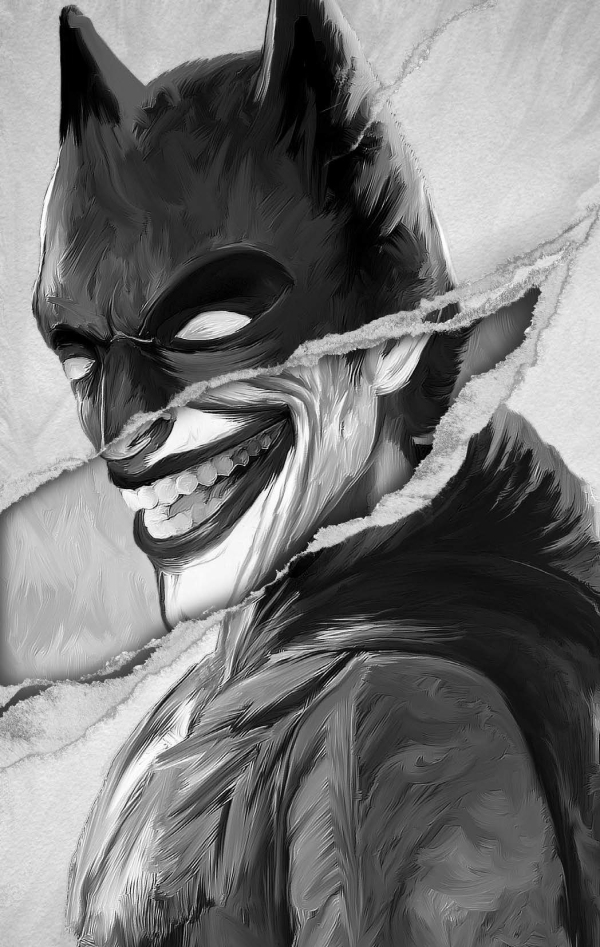 Треугольник света заливал стол и карты желтым сиянием. Их торсы и руки были хорошо видны, но головы и плечи оставались в тени. Отблески света играли на дико взъерошенных зеленых волосах Джокера и краях маски Бэтмена. Джокер посмотрел на две карты треф в своей руке, занес их над столом, словно для создания драматического эффекта… и сыграл их.