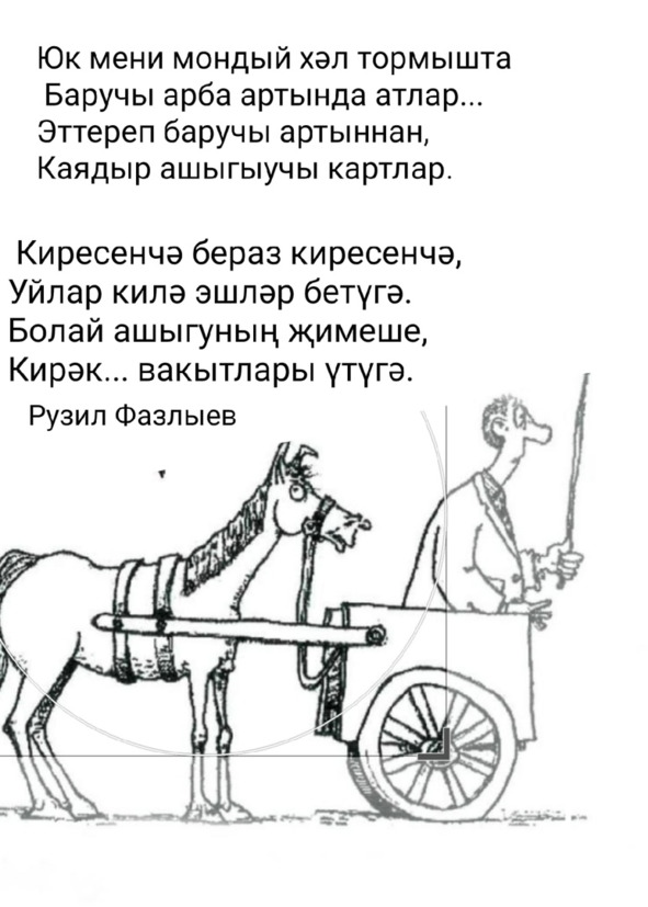 Кеше арбасында бару диләр,Барган юлың синнән тормаса.Иярәсең яки ияртәләр…Үзеңнеке әгәр булмаса.Үз тормышың, үзе хыялларың,Дусларың hәм якын туганнар.Җирең телең илең динең уең,Синең үзеннеке булганнан.Ябышмыйча кеше арбасына,Үз юлыңнан бара алганнан.Колы булмый җирдә берәүнең,Син ирекле булып калганнан.Коллык бары Аллаh алдында,Чөнки язмыш аңа бәйләнгән.Тормыш җилен үзең тоя алып,Үз арбанда узу җәйләрдән.Үзе арбаң тәүге бишек кебек,Кошлар өчен оя шикелле.Шул арбада бара алса гына,Кеше күңеле туя шикелле.Кирәк, кирәк