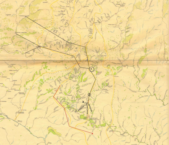 1 – район Большая Холань—Василдол—Холки (встреча союзников); 2 – район Шиповатое—Прилютова (привал перед переходом Сюурлея); 3 – район Староверовка—Шевченково—Боровское (место битвы); Х – место окончания битвы;
