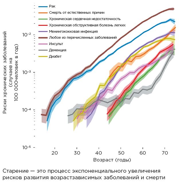 Казалось бы, решая одну медицинскую проблему за другой, смерть можно отодвинуть дальше и дальше, а перспективы бесконечной жизни без болезней, наоборот, приблизить. К сожалению, это не так. Оказывается, вероятность возникновения каждого из хронических заболеваний вроде диабета 2-го типа, инфаркта или болезни Альцгеймера быстро нарастает с возрастом (см. график). Обратите внимание на масштабы по осям: по горизонтали годы с момента рождения (так называемый хронологический возраст), а по вертикали – уровень заболеваемости (число заболеваний в год на 100 000 человек). Обратите внимание, что график выполнен в логарифмической шкале – увеличение риска на «одно деление» отвечает росту вероятности заболевания в 10 раз.
