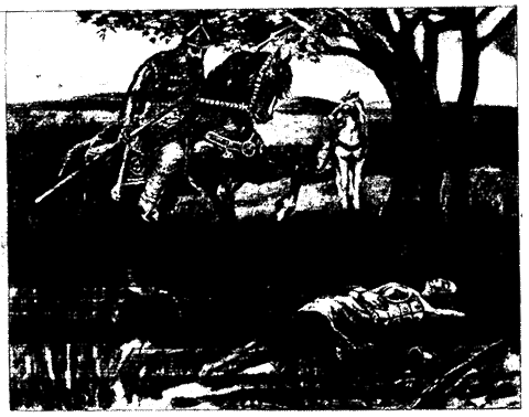Да едучи бором частым, дремучим, сбился добрый молодец с пути и заехал на тот холм, где рябина с черемухой неразлучно росли; видит, – раскинулся под рябиной добрый молодец, спит сном богатырским, а доспехи на нем, как жар горят; бродит вокруг него ратный конь, а в ногах у доброго молодца пёс дозорный лежит, Увидал боевой конь недруга, заржал, топнул оземь копытом, – спит, не ворохнется славный витязь Филя, – спит и беды не чует… Вскочил пес дозорный, забрехал на недруга.