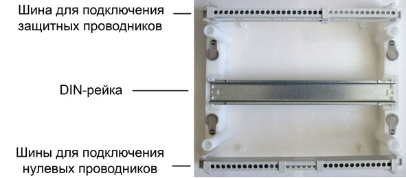 Внутренняя часть электрощита, независимо от вида и страны производителя, выглядит примерно одинаково: DIN – рейки, на которые устанавливается оборудование, и шины N и PE для подключения нулевых и защитных проводников (фото).