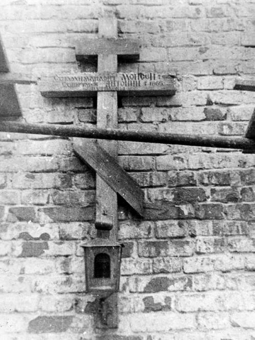 Крест на стене восстанавливаемого храма. Оптина. 1993 год