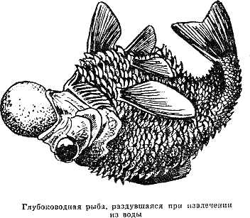 Как же рыбы выдерживают тяжесть слоя воды толщиной в несколько километров? Им это не причиняет никаких болезненных ощущений. Дело в том, что тело, мышцы и кости рыб пропитаны водой, и рыба ощущает одинаковое давление изнутри и снаружи. Но если вытащить глубоководную рыбу на поверхность воды, внутреннее давление перестает уравновешиваться наружным. Рыбу раздувает, глаза выпучиваются, внутренности выворачиваются через рот. В таком раздутом виде рыба уже не может погрузиться на глубину.
