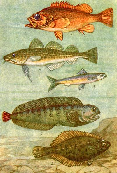 1 – морской окунь; 2 – треска; 3 – сельдь; 4 – зубатка; 5 – камбала