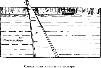 На стр. 60 изображена схема лова миноги на фонарь: s – источник света, фонарь; е – столб воды, освещенный пучком световых лучей; d – ледяная поверхность; а и в – проруби (а – с фонарем, в – где происходит лов). Минога, двигавшаяся все время в темноте навстречу быстроводной струе, наталкивается на свет (е) и, прячась от него, поднимается вверх, в более затемненное пространство, где и попадает в сак ловцу.