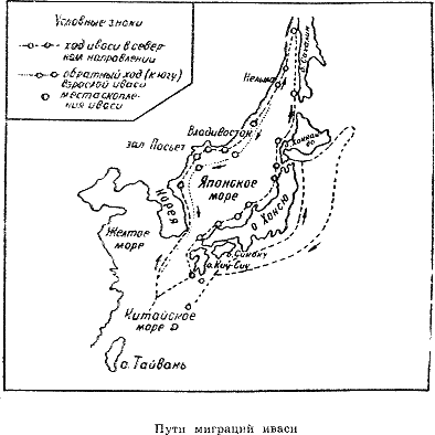 Весной иваси из южной части Японского моря, возможно, и из более южных морей, направляется к северу, образуя две ветви: одна идет к нашему западному берегу Японского моря и достигает Сахалина, другая движется вдоль западных берегов Японии и также доходит до Сахалина. Затем обе ветви, объединившись, спускаются к югу вдоль наших берегов Японского моря.