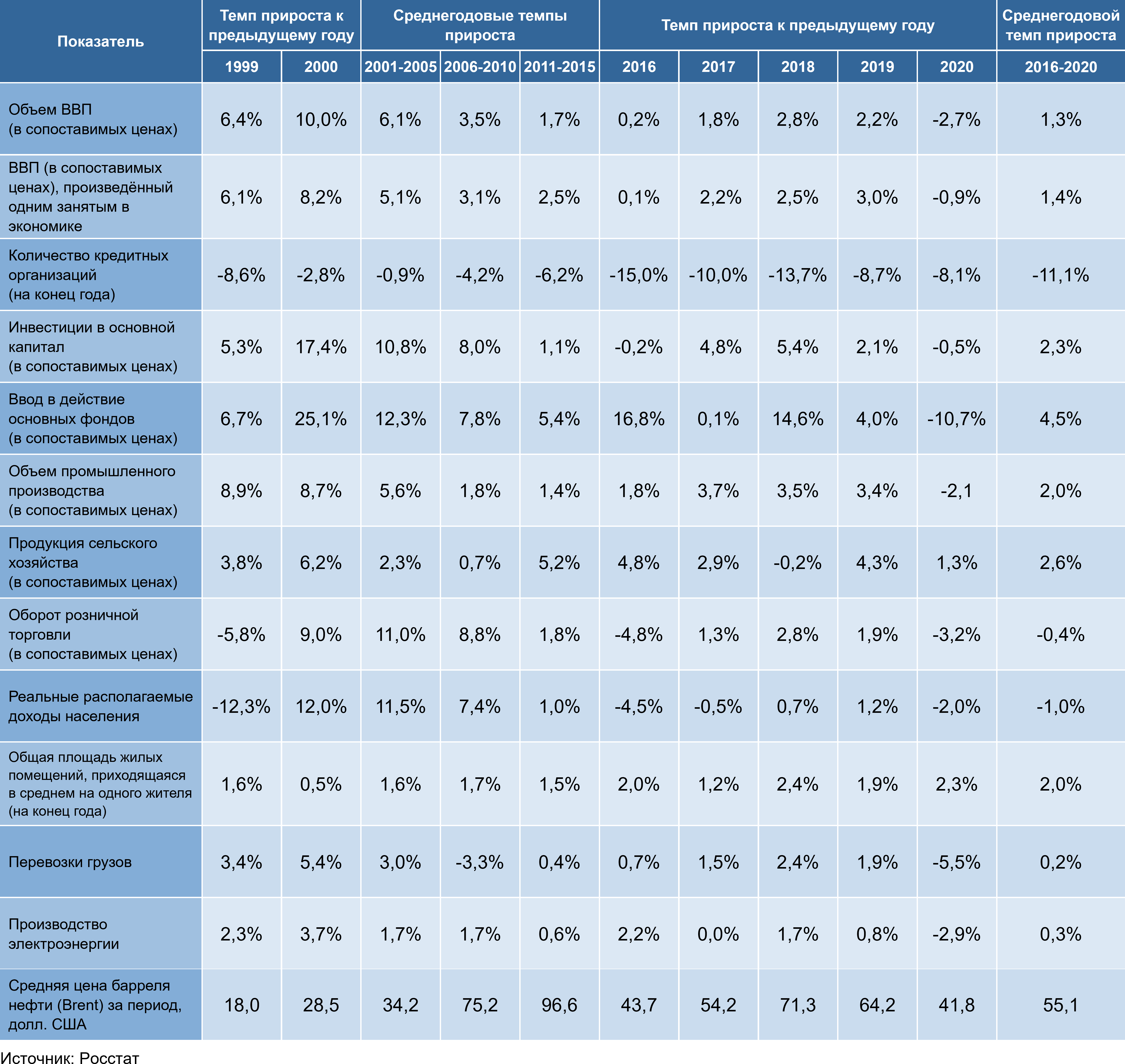 Динамика основных показателей развития страны, иллюстрирующая содержание проводимой социально-экономической политики в 1999–2000 гг. и 2001–2020 гг.