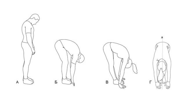 Наклонить вперёд голову до касания подбородком груди (Рис. 2.5 А). Продолжить наклон вперёд. Руки расслаблены. Колени при наклоне можно немного согнуть (Рис. 2.5 Б). В конце наклона выпрямить колени (Рис. 2.5 В). Остаться в положении наклона (Рис. 2.5 Г).