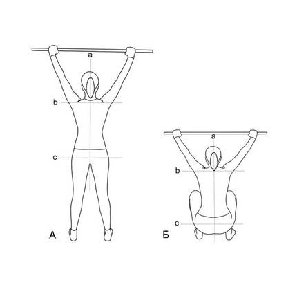 • Положение гимнастической палки, линии плечевого «b» и тазового «с» пояса. В норме параллельны. Несоответствие линий плечевого пояса и таза указывает на искривление позвоночника. Состояние позвоночника проверяется в тесте «Поэтапное сгибание».