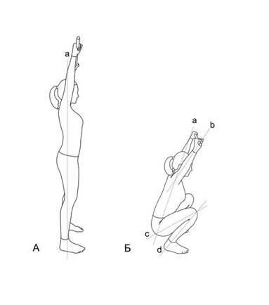 Рис 2.3 Тест приседания с палкой над головой вид сбоку (объяснения в тексте).