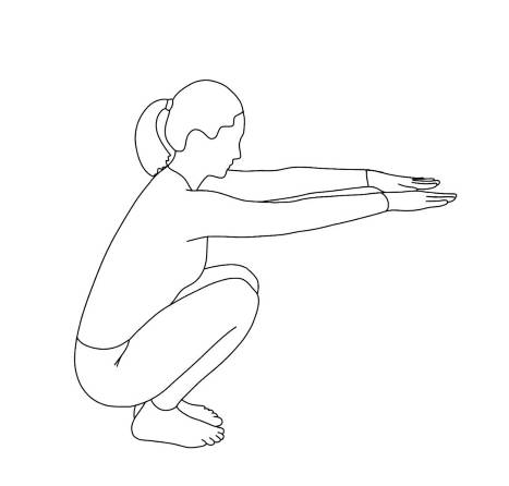 Если в первом тесте при движениях рук возникли болевые ощущения, то удерживать палку над головой не нужно. Приседаем с подъёмом рук перед собой.