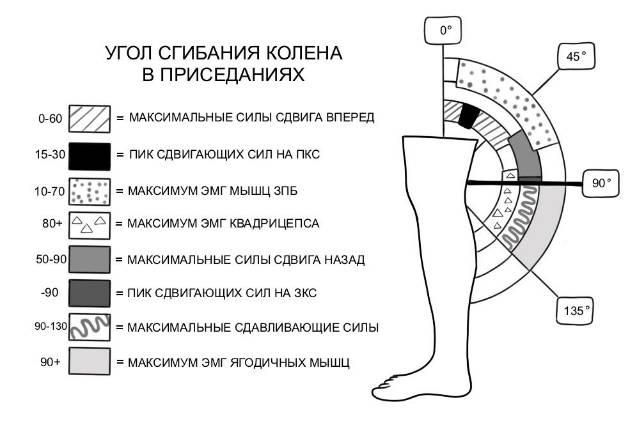 В полных приседаниях оптимальная ширина стойки позволяет в конечном положении касаться ягодицами ахилловых сухожилий, а центральная ось бедра совпадает с центральной осью голеней.