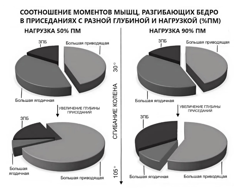 Рис. 3.2 Соотношение моментов сил мышц, разгибающих бедро в приседаниях с разной глубиной и нагрузкой. Независимо от нагрузки, с увеличением глубины приседаний уменьшается вклад в разгибание тазобедренных суставов больших ягодичных мышц. Из-за недостаточной силы больших приводящих мышц повышается вклад в разгибание ТБС мышц задней поверхности бедра (ЗПБ). В ответ на увеличение вклада ЗПБ требуется существенное увеличение моментов сил квадрицепсов.