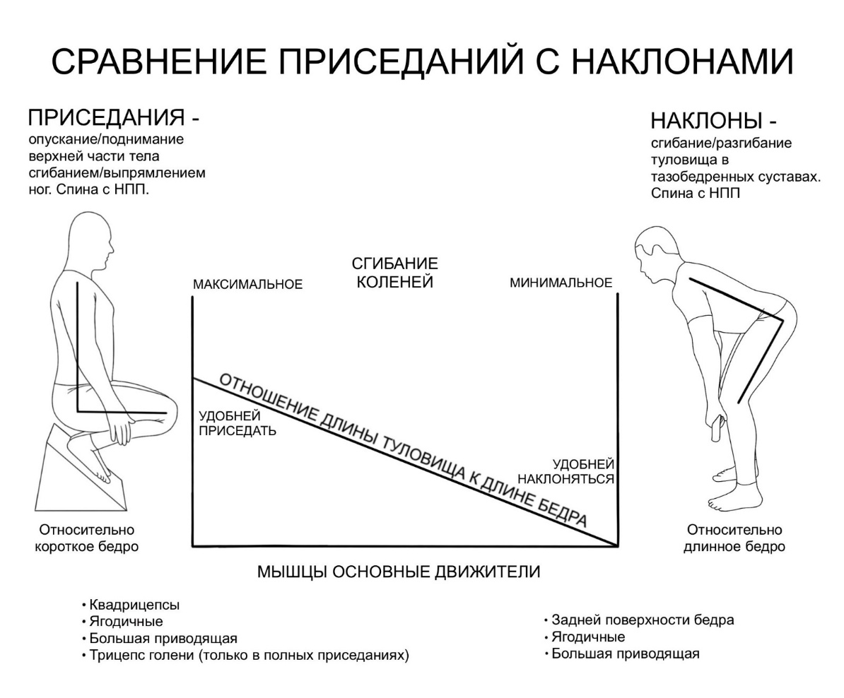 В зависимости от соотношения длин сегментов тела ваше тело больше предрасположено к приседаниями или наклонам (Рис. 3.3). Основные сегменты, которые нужно учитывать: туловище, бёдра и голени.