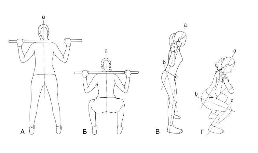 Рис. 3.4 Приседания со штангой на спине: А) исходное положение вид сзади, ноги и руки симметрично от центральной оси тела; Б) конечное положение вид сзади, симметрия сторон сохранена; В) исходное положение вид сбоку, НПП с небольшим сгибанием в коленных и тазобедренных суставах; Г) конечное положение вид сбоку, НПП сохранено.