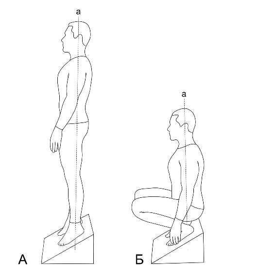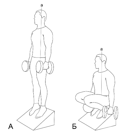 Полные приседания на доске 30 градусов без отягощения: А) исходное положение ноги и спина выпрямлены, плечевой пояс расслаблен; Б) конечное положение. Туловище сохраняет положение, близкое к вертикальному. Небольшой наклон за счёт сгибания тазобедренных суставов облегчает сохранение НПП.