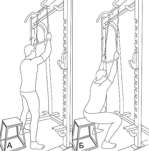 Рис. 3.7 Приседания с противовесом: А) исходное положение; Б) конечное положение. Применяются эспандеры низкой и средней жёсткости, чтобы клиент не висел на них, а компенсировал часть своего веса тягой эспандера. Тумба используется как ориентир.