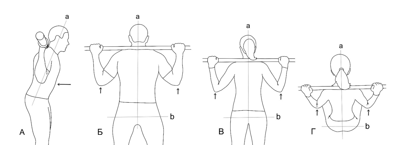 Рис. 3.8 Исходное положение в приседаниях со штангой на спине: А) вид сбоку; Б) и В) вид сзади; Г) вид сверху на конечное положение. Стрелками показаны места контроля: на виде сбоку – рёберный край показывает сохранение НПП, на виде сзади положение локтей – ориентир симметрии расположения частей тела и осевого вращения позвоночника, если один локоть впереди другого.