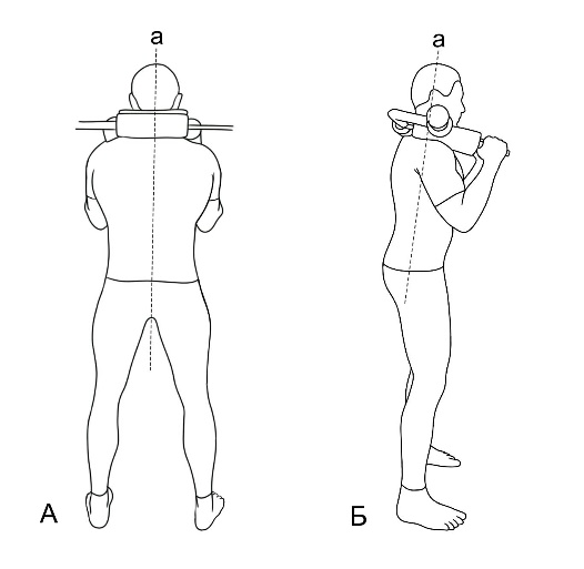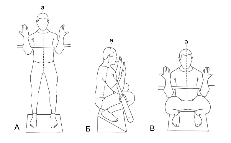 Стоя, ноги симметрично расставлены, вес тела равномерно распределён между ногами, позвоночник в нейтральном положении (Рис. 3.4 А).