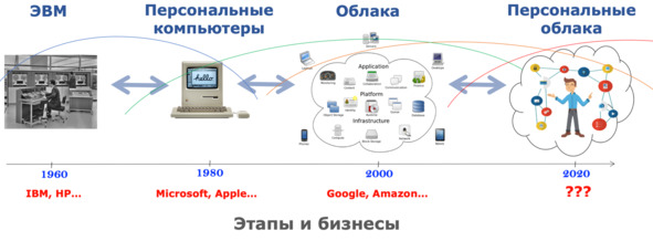 Название «Персональные облака» – идеально подходит для обозначения нового этапа в эволюции вычислительной техники. Не сложно спрогнозировать, что в информационных технологиях в ближайшем будущем будут доминировать гипер-персональные умные устройства и мультимодальные формы общения: с одной стороны, человек будет окружен разнообразными датчиками, экранами, микрофонами, гаджетами, смартфонами, а с другой – ему будут доступны неограниченные информационные ресурсы, как в локальных, так и в удаленных облаках. И вследствие этого появится новая среда, в которой виртуальные помощники, обладающие искусственным интеллектом, соединят вместе «Умный дом» и «Умное здоровье», «Профессиональных помощников» с «Персональными», и эта новая среда будет способна совершать физические действия, общаться на естественном языке и самое главное – понимать конкретного человека.