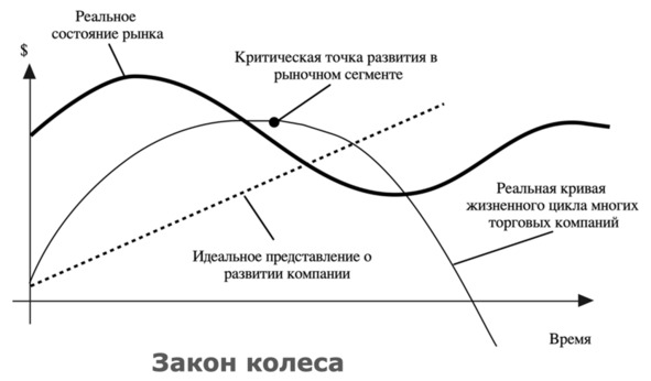 Можно по-разному интерпретировать двадцатилетние периоды в эволюции вычислительной техники, например, наложить полусинусоиды на технологические фазы, и определить участки, на которых та или иная платформа достигает пика своего развития. Но вот однажды успешный бизнесмен решил объяснить программисту, в чем состоит секрет успеха в бизнесе, и согласно его модели, рынок подчиняется «закону колеса», а правило успеха он сформулировал следующим образом: «Бизнес нужно начинать в нижней точке цикла, а продавать в наивысшей. О. Т.», что неплохо согласуется с аксиомой об инвестициях в моменты переходных периодов и совпадает с поведением успешных компаний, о которых шла речь выше.