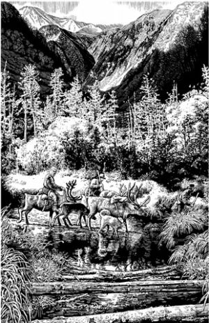 Шумно становится на нашей одинокой стоянке. Разгорается костёр. Людской говор повисает над уснувшей долиной. Отпущенные олени бегут в лес, туда же уплывает и мелодичный звон бубенцов.