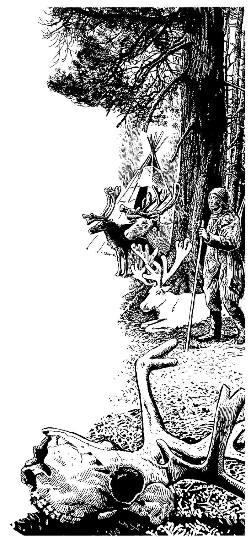 Выходим на поляну… «Вот они, лесные люди, прошлое этой земли», – подумал я, увидев остроконечные жилища кочевников, лес рогов отдыхающих оленей и вокруг большого костра плосколицых, загорелых людей, освещённых бликами яркого пламени.