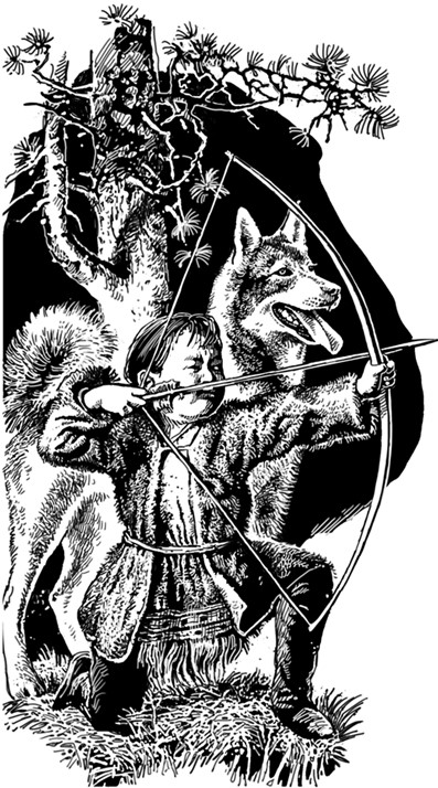 Лицо Битыка становится серьёзным. Мальчишка внимательно осматривает лук, отходит несколько дальше от костра. Вот он опускается на правое колено, а левую ногу, слегка согнутую, выставляет вперёд, упирается ею в землю. В его движениях нет обычной детской торопливости. Он вытягивает на всю длину левую руку с луком, прикладывает стрелу и начинает медленно оттягивать тетиву. Всё в нём напряжено: глаза, мышцы, каждый волосок. Лицо багровеет. Но что-то мешает ему. Мальчишка отпускает тетиву, вскакивает, быстро подтягивает лосёвые штаны и снова опускается на землю. Твёрже ставит левую ногу и делает глубокий вдох. Снова напрягается, тянет изо всех сил тетиву, стрела с характерным свистом проносится между освещённых костром стволов, вонзается в «зайца»…