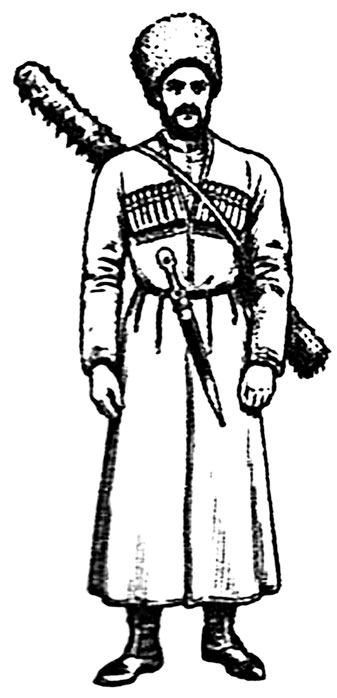 В полку были винтовки старого образца, системы Карле, с бумажными патронами, которые при переправе через реку намокали и в ствол не лезли, а у нас легкие берданки с медными патронами, 18 штук которых я вставил в мою черкеску вместо серебряных газырей. Вместо сапог я обулся в поршни из буйволовой кожи, которые пришлось надевать мокрыми, чтобы по ноге сели, а на пояс повесил «кошки» – железные пластинки с острыми шипами и ремнями, которые прикручивались к ноге, к подошвам, шипами наружу. Поршни нам были необходимы, чтобы подкрадываться к туркам неслышно, а «кошки» – по горам лазить, чтобы нога не скользила, особенно в дождь.