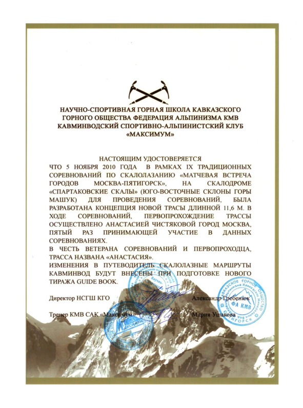 • Ни одного несчастного случая за 40 лет деятельности в альпинизме и скалолазании, ни одного результата ради результата и ценой потерянного здоровья.