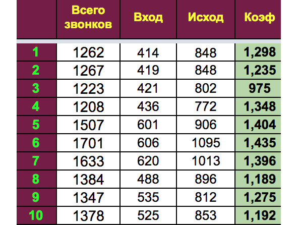 Обязательно начните вести постоянный подсчет этих показателей. Ниже вы видите небольшую выборку нашей статистики – количество звонков и коэффициент допродаж (чистая прибыль в среднем на 1 заказ).