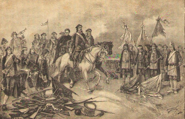 Петр принимает сдачу знамен шведами. Старинная гравюра.