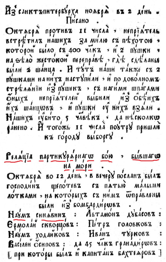 Потом были стычки со шведами при Копорском морском заливе в урочище Сойкиной горы, где Наум Синявин проявил геройские качества. Во время военных действий он получил ранение «…во время сражения прострелена насквозь нога».