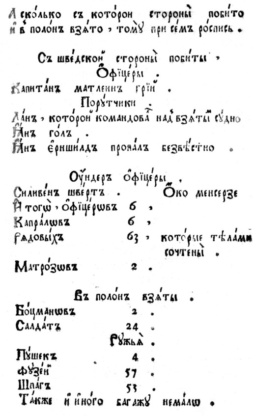 В «Истории Лейб-Гвардии Преображенского полка» про этот момент сказано: «…шведы представляли нестройную толпу бегущих, беспощадно уничтожаемую Русскими: 4 орудия, 137 знамен и штандартов, до 4000 пленных, обоз и шведский лагерь достались победителям. К полудню все было кончено и шведская армия, столь грозная прежними своими победами, почти не существовала».