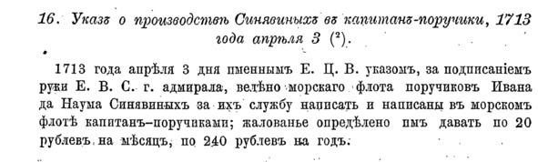 Пётр отдаёт указ Ивану Акимовичу из Санкт Петербурга по поводу поездки для набора из северных моряков на службу во флот: «Указ Капитану Порутчику Синявину! Ехать ему к городу Архангельскому и приехав как там у города, так в Колском и в Сумском острогах и в других местах, где есть лутчие работники, которые хотят на море за рыбным и звериным промыслом на качах, морянках и протчих судах, набрать в матрозы 400 человек и чтоб не были более как до 30 лет, и для того набору взять себе в помочь у Вице-Губернатора офицеров (или дворян),також и солдат сколько потребно, и за ними накрепко самому тебе смотреть, чтоб оные в том наборе не учинили каких блудень, и как оные набраны будут, тогда оным учинить имянной список и пересмотря их отправить в путь с довольным на проход провиантом при себе с добрым приводом, которого взять у Виц-Губернатора, придав ему по разсмотрению конвой и распорядя их в пути вручить с имянным списком оному продавцу и потом ехать тебе самому к нам наперёд».