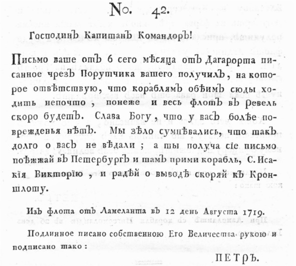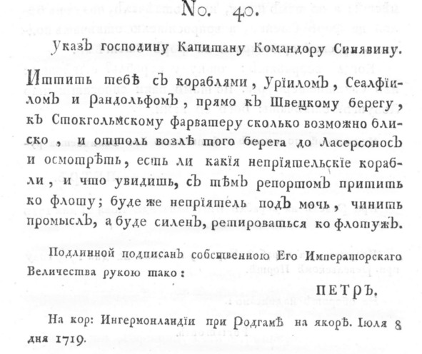 Государю Петру Алексеевичу было присвоено звание «адмирала красного флага… дабы в знак понесённых своих трудов в сию войну». Науму Акимовичу Синявину было присвоено звание контр-адмирал или по-старому шаутбенахт. Этот мир укрепил за Россией значительные приморские порты. Нашими стали Выборг, Нарва, Ревель и Рига. Уже не окно прорубил Пётр в Европу, а целую дорогу.
