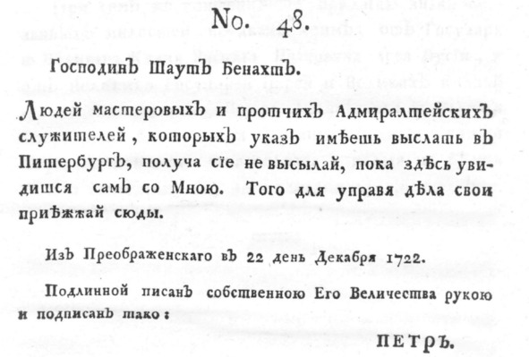 В сентябре в Петербург прибыл персидский посол. Император Петр Алексеевич, посетив адмиралтейство приказал «все палаты и магазины чистотою убрать и экипажеским офицерам и мастерам быть в добром платье, понеже сего числа 12 сентября всё будет смотреть персидский посол с его свитою, да французский капитан». Адмиралтейской конторой в столице временно назначен «управляющий должность директора» капитан-командор Иван Акимович Синявин вместо вице-президента и адмирала Корнелия Крюйса. Новому исполняющему обязанности адмиралтейство прислало: «1000 человек с Котлина острова с капитаном-поручиком Лопухиным направить для адмиралтейских работ в гавань к кранам, для варения пику к смольной бане, для таскания на магазины брусья».