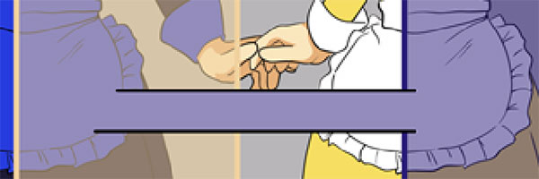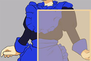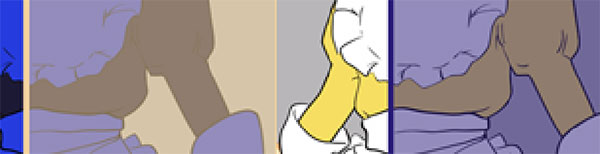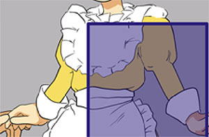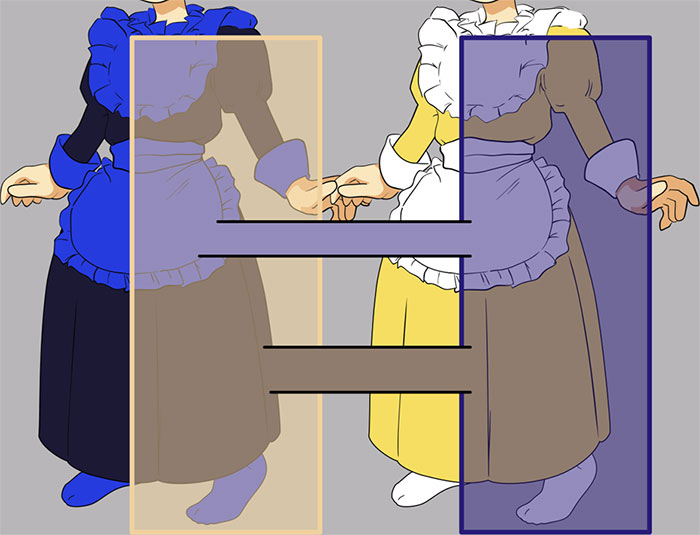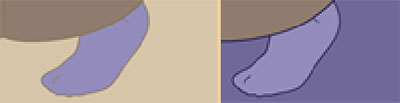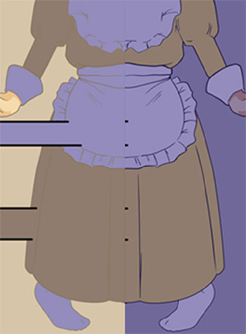 Два выделенных прямоугольника соединятся двумя линиями. Одна соединяет фартуки. И тогда мы видим, что оба фартука в выделенной области одного и того же цвета (лилового). Обувь и фартук на каждой картинке одного цвета. Так? Присмотритесь повнимательнее. Так. Значит на обеих картинках левая нога так же одного цвета. Ни белого и ни синего (а лилового).