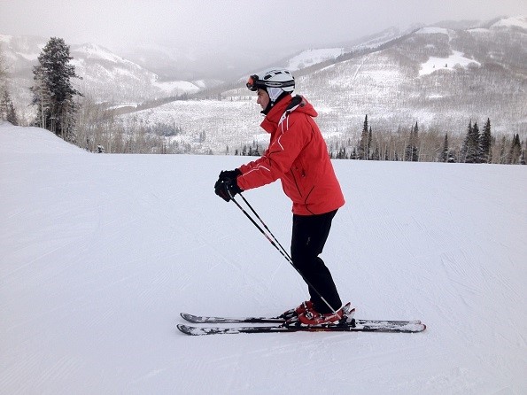 Как правило студенты начинают сгибать туловище. Это неправильно, так как чрезмерно согнутый и поданный вперед корпус создает слишком большое давление на переднюю часть лыж!