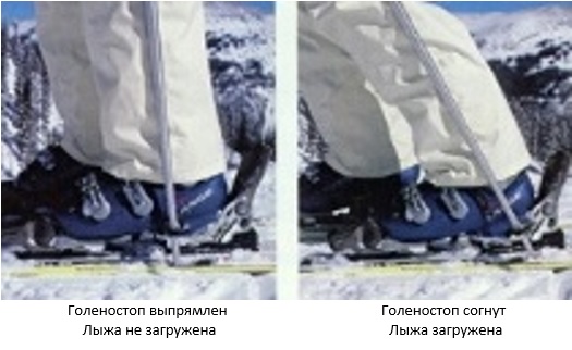 При незагруженной лыже вес лежит на пятках, при загруженной на передней части ботинок, что немедленно сказывается на загрузке лыж.