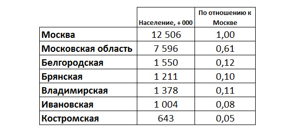 В таблице ниже представлены абсолютные цифры населения по областям и пропорции по отношению к Москве (население Москвы принимается за 1, пропорции определяются делением населения областей на население Москвы – 12 506 тысяч, если верить интернету).