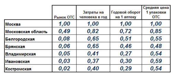 Таблица ниже иллюстрирует это. Если ввести дополнительные параметры (например, для безрецептурных препаратов – общий рынок ОТС, затраты на человека в год на препараты ОТС, годовой оборот таких продуктов на 1 аптеку в территории и среднюю цену упаковки на безрецептурный препарат), ситуация несколько изменится: