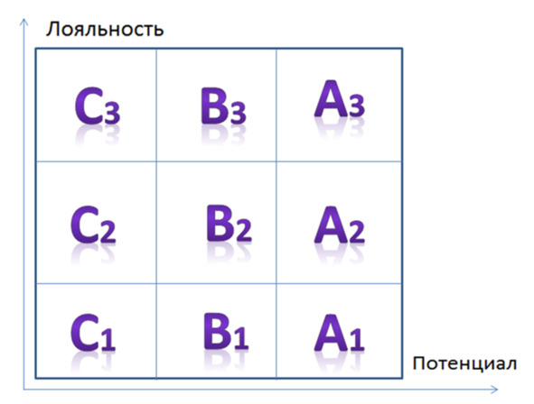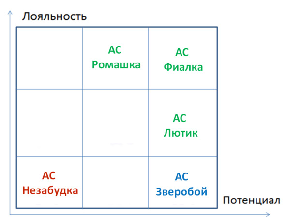 Аналогичным образом классифицируются и все остальные клиенты КАМа. Затем они распределяются по таблице «Потенциал – Лояльность» по 9-и квадратам, что даёт нам 9 разных типов ключевых клиентов.